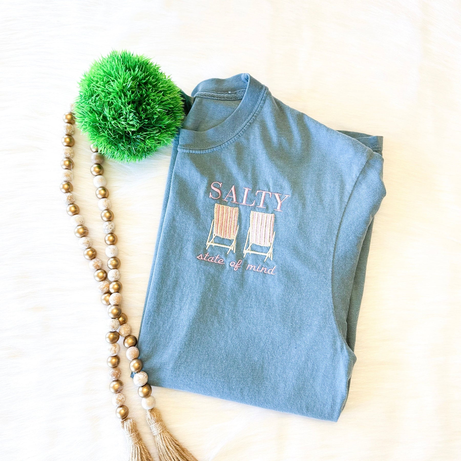 Channel calm, coastal energy with the “Salty State of Mind” embroidered tee. Stitched in ocean tones on a soft ice blue Comfort Colors shirt, this one’s for sandy toes, sea breezes, and unapologetic chill. Whether you’re on vacation or just pretending to be — this tee delivers salt-air vibes, no sunscreen required.