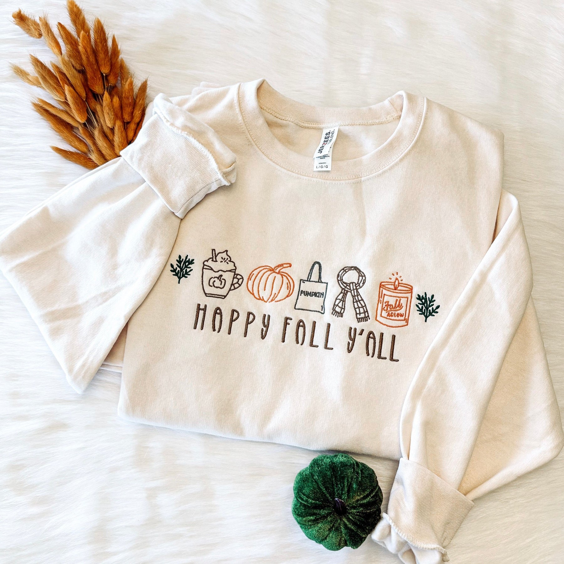 Soft fleece, sweet cream color, and embroidered icons that say it all: scarves, mugs, leaves, candles, pumpkins. This “Happy Fall Y’all” sweatshirt is your go-to for apple picking, cider sipping, and living your full fall fantasy — without sacrificing comfort.