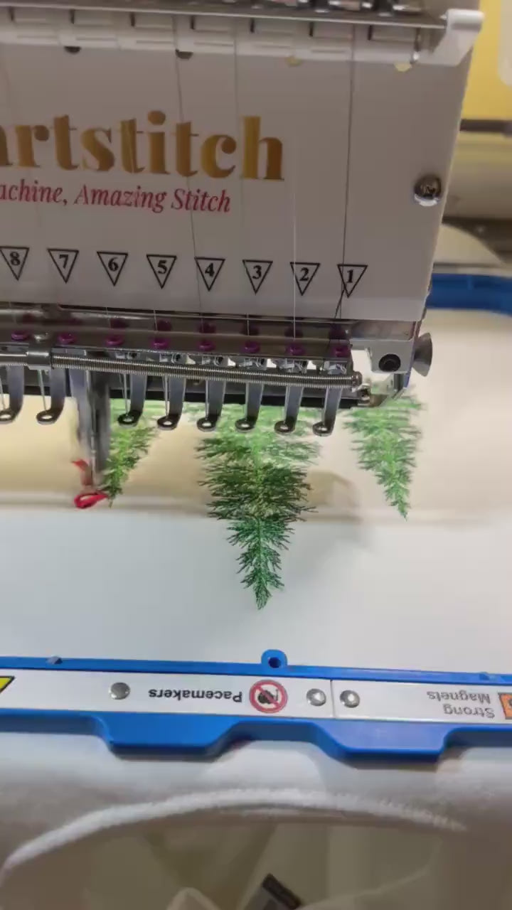 Embroidered Christmas trees with red bows + “Merry & Bright” lettering