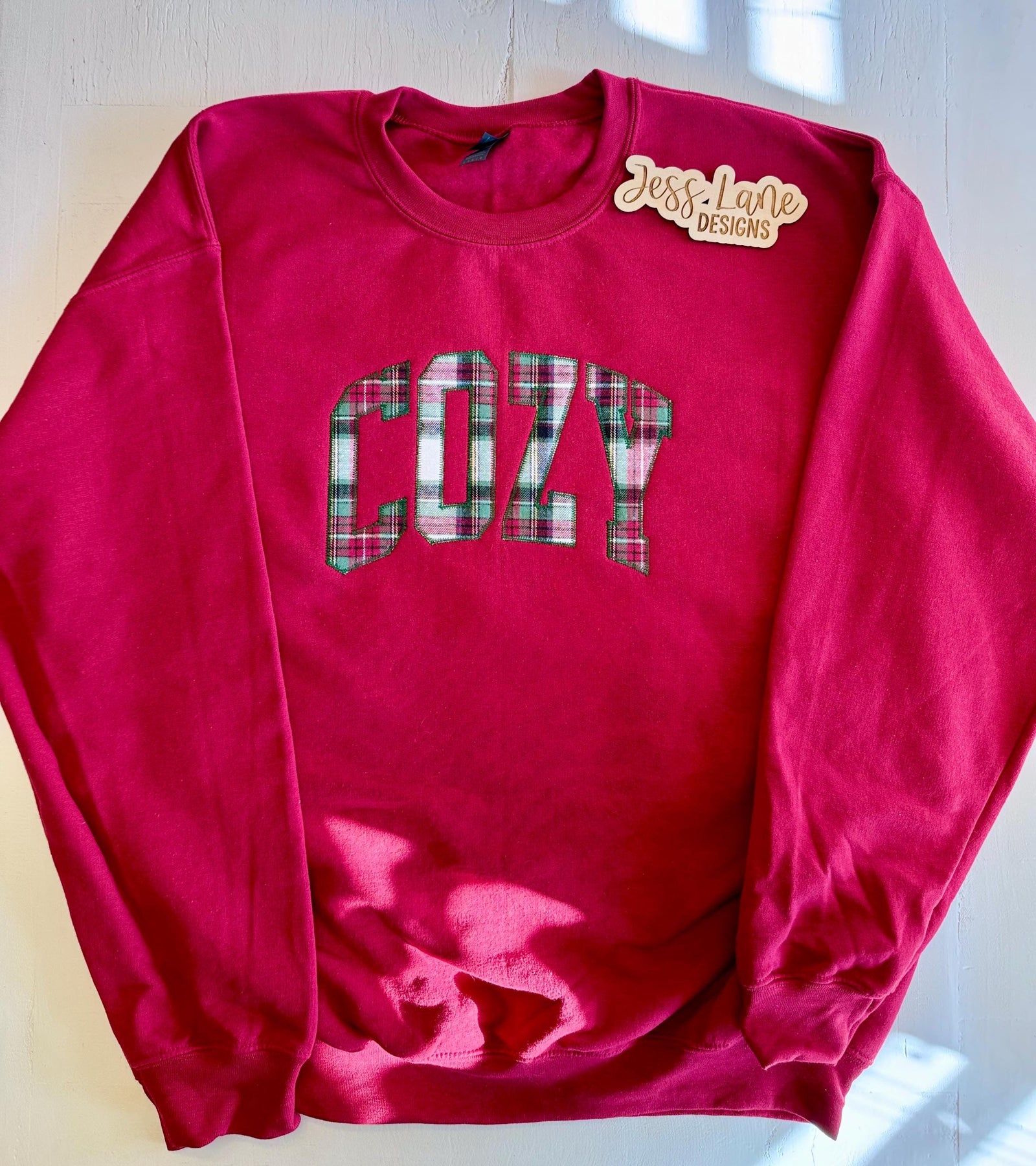 This soft cardinal red Gildan crewneck (or the tee option of your choice) features “COZY” created with flannel fabric and finished with embroidered detailing — giving you that warm, classic, winter-inspired look everyone loves. It’s festive, comfortable, and stitched to order with care.