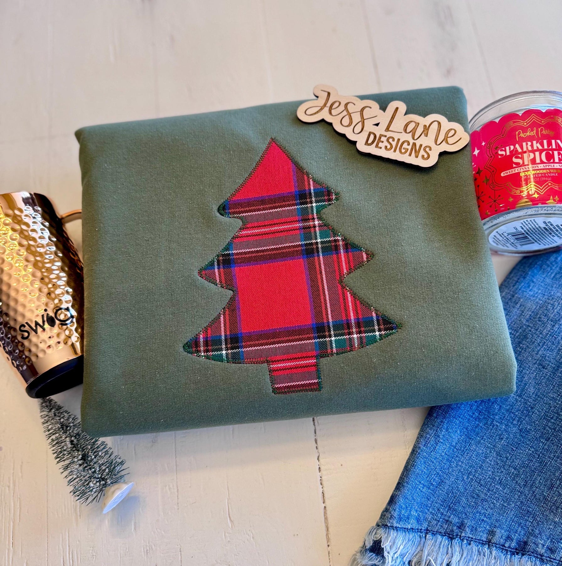 Embroidered plaid flannel Christmas tree design on sweatshirt or t-shirt